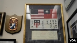 罗拉巴克议员的墙上还挂着他父亲在二战期间作为美国空军到中国援助抗日当时中国政府发的这个袖章希望中国民众对遇到困难的美军给予帮助。可见议员对这段和中国的渊源很自豪。