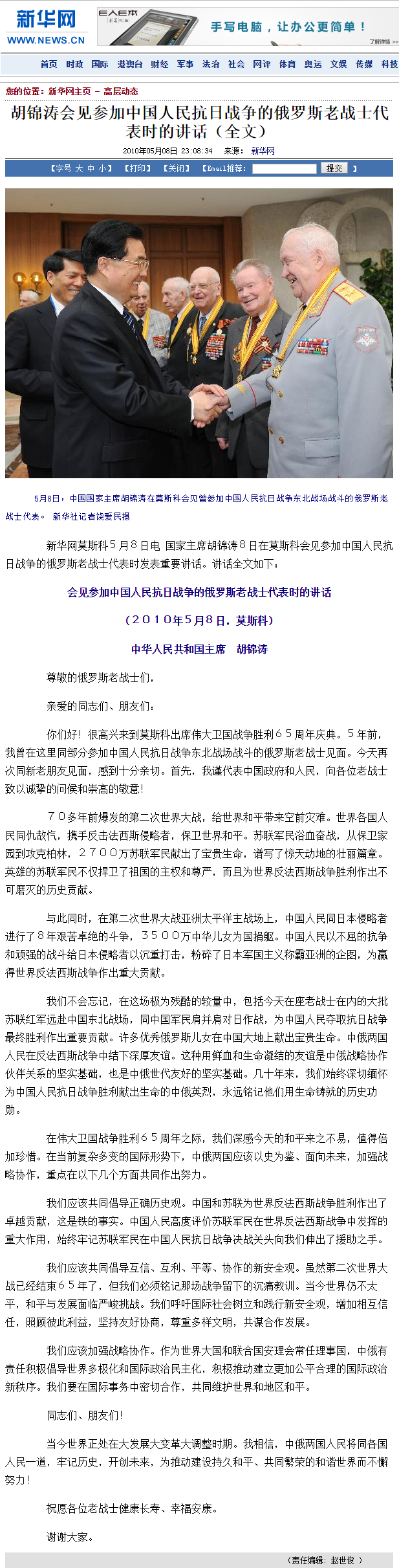 人民网旗下“中国共产党新闻”网站刊载过一篇文章,题为《毛新宇回忆伯父毛岸英:他曾带兵打到柏林》(http://cpc.people.com.cn/GB/85037/85038/8476444.html)。这篇注明来源为“人民网毛新宇的博客”的博文,篇首引用了据称为2005年5月8日胡锦涛主席在会见参加中国抗日战争的俄罗斯老战士代表的讲话内容:“在那场人类历史上空前惨烈的战争中,中苏两国人民并肩作战,结下了生死与共的友谊。当时,中华民族的许多热血儿女,包括毛泽东主席的长子毛岸英,毅然投身苏联红军抗击德国法西斯的作战。”